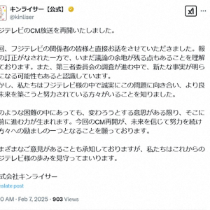 キンライサー公式Xから 給湯器の設置などを手掛ける「キンライサー」は7日、SNSで「フジテレビのCM放送を再開いたしました」と報告した。 「さまざまなご意見があることも承知しておりますが、私たちはこれからのフジテレビ様の歩みを見守ってまいります」と自社の姿勢を示した。 同局の関係者と直接話したとし「誠実にこの問題に向き合い、より良い未来を築こうと努力されている方々がいることを知りました」と説明。 「今回のCM再開が、未来を信じて努力を続ける方々への励ましの一つとなることを願っております」とつづった。 スポニチアネックス ******* **************************************************************************** ******* ****************************************************************************
