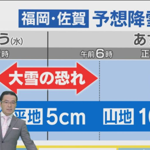 6日のポイントは「朝まで大雪の恐れ」です。朝にかけて強い寒気が流れ込むため、引き続き大雪の恐れがあります。5日の福岡市内は晴れ間もありましたが、雪も舞い、凍える寒さでした。強い寒気の影響で断続的に雪が降り、山地や内陸を中心に雪が積もりました。日中の最高気温は5℃前後と、厳しい寒さが続きました。6日(木)も朝にかけて引き続き大雪の恐れがあります。日中はいったん雪は小康状態となりますが、寒波の第2波が7日(金)夜から土曜日にかけて襲来するため、引き続き、週末にかけても積雪や凍結による交通障害などに十分な注意が必要です。予想降雪量です。6日夕方までに予想される雪の量は、多い所で、平地で5センチ、山地で10センチの予想です。朝にかけて大雪の恐れがあります。積雪や凍結による交通障害、農作物の管理、電線への着雪による停電、水道管の凍結などに十分ご注意ください。福岡・佐賀の予報です。6日も冬型の気圧配置が続き、強い寒気の流れ込みが続く見込みです。朝にかけて平地・山地ともに大雪となり、雪が同じ所で降り続いた場合は警報級の大雪となる恐れがあります。積雪や路面凍結による交通障害、水道管の凍結などに注意が必要です。日中の最高気温は5℃前後と、厳しい寒さが続くでしょう。 週間予報です。金曜日は、日中は寒気がやや緩んで雨が混じる所もありますが、夜から土曜日は再び寒気が強まり、雪が降りやすくなります。引き続き積雪による路面の凍結や、水道管の凍結に注意が必要です。日曜日には冬型の気圧配置が緩み、月曜日と火曜日は晴れ間が戻る見込みです。日中の最高気温は、今週いっぱい5℃前後と厳しい寒さが続くでしょう。 最終更新日:2025年2月5日 18:54